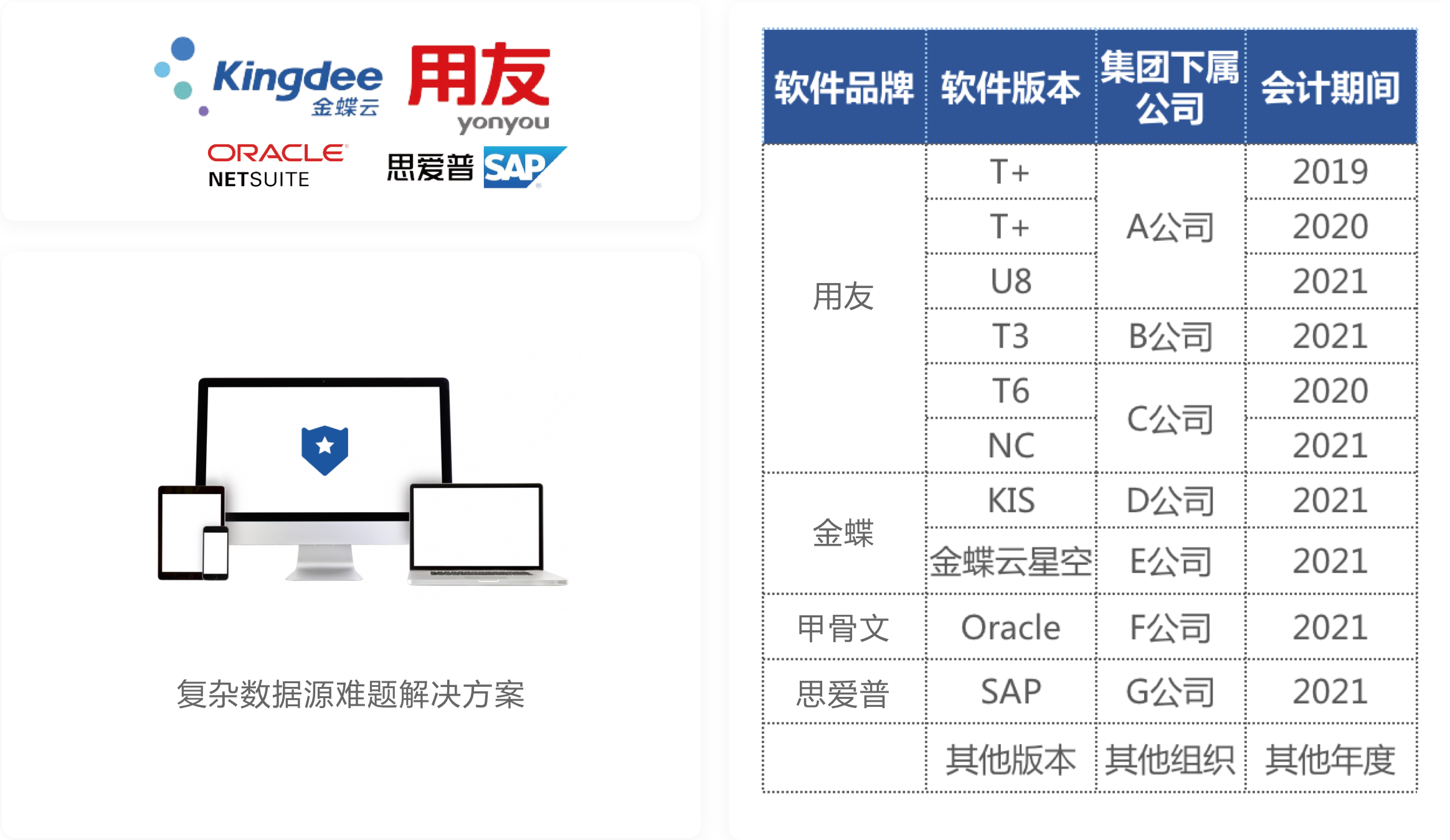 跨軟件版本、跨組織和跨年度主數(shù)據(jù)統(tǒng)一,憑證數(shù)據(jù)實時抓取并映射,支持主流財務(wù)ERP版本